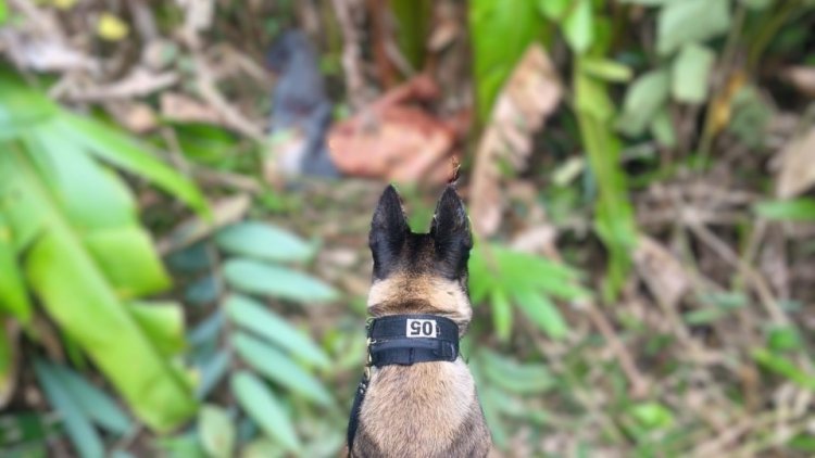 Por volta das 15h, o cão policial “Buriti”, especializado em busca e captura, localizou um rastro em meio à mata fechada, distante do local do crime. Durante as buscas na área indicada, os policiais encontraram uma fogueira com pedaços de borracha e um terçado, evidenciando a recente presença do suspeito.